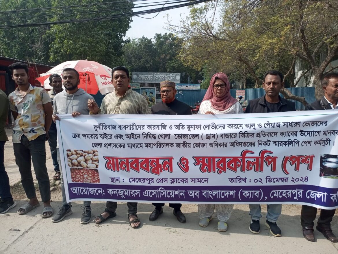অতি মুনাফালোভী ব্যবসায়ীদের কারসাজিতে আলু ও পেঁয়াজের দর বৃদ্ধি এবং ভোজ্য তেল বিক্রির প্রতিবাদে মেহেরপুরে মানববন্ধন