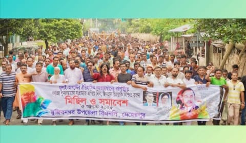 জুলাই-আগস্টের ঐতিহাসিক গণঅভ্যুত্থানের বর্ষপূর্তি উপলক্ষে গণতন্ত্র পুনরুদ্ধার আন্দোলনের অংশ হিসেবে মেহেরপুরের মুজিবনগর উপজেলা বিএনপি গণমিছিল ও সমাবেশ অনুষ্ঠিত হয়েছে