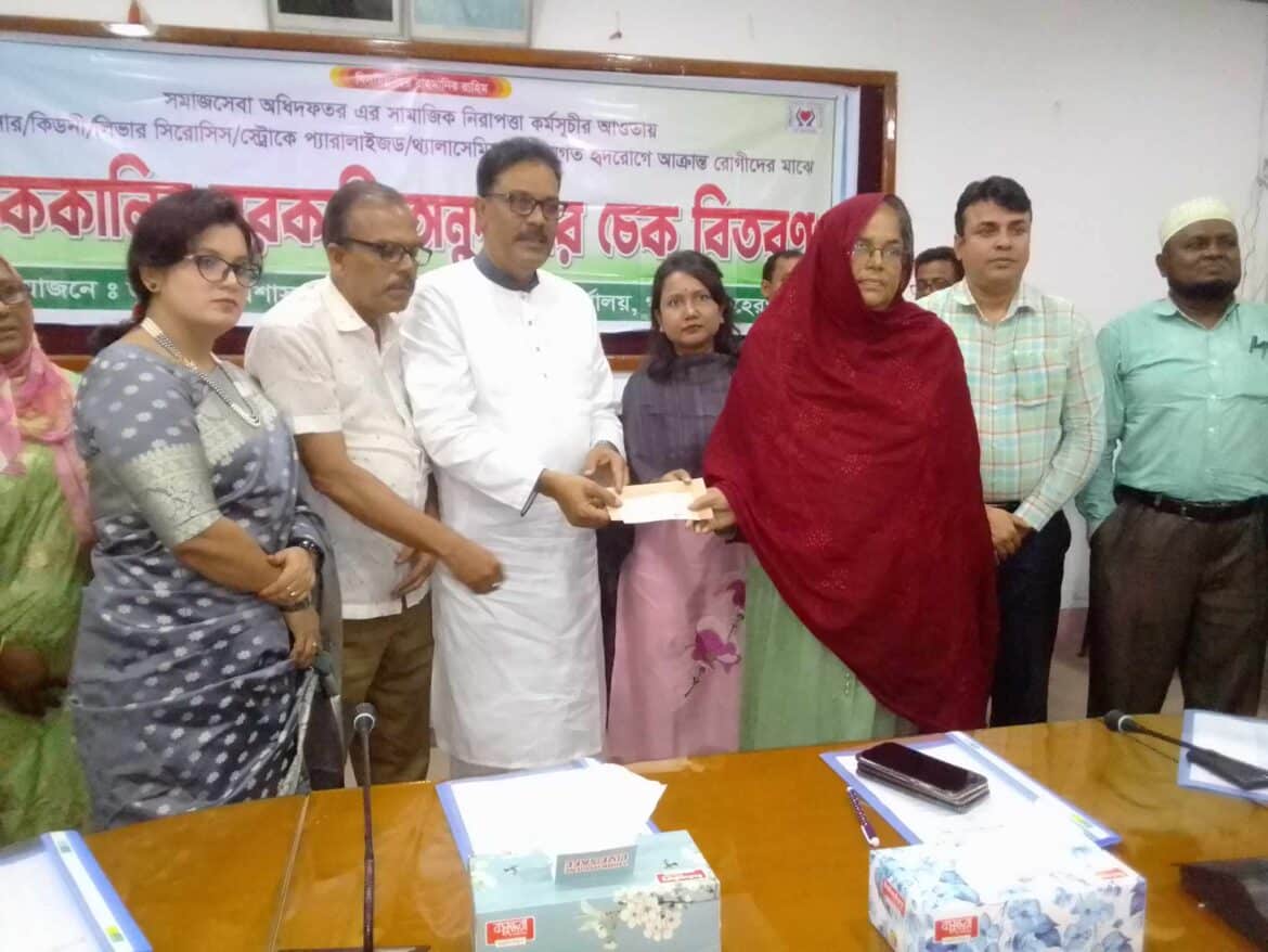 এম চোখ ডটকম,গাংনী;গাংনীতে সমাজ সেবা অধিদপ্তরের সামাজিক নিরাপত্তার কর্মসুচীর আওতায় ক্যান্সার,কিডনি,লিভার সিরোসিস,স্ট্রোক,প্যারালাইজড,থেলাসেমিয়া ও জন্মগত হৃদরোগে আক্রান্ত রোগীদের মাঝে এককালীন সরকারি অনুদানের চেক বিতরণ করা হয়েছে।আজ মঙ্গলবার বিকেলে গাংনী উপজেলা সভাকক্ষে উপজেলা প্রশাসন ও উপজেলা সমাজ সেবা অধিদপ্তরের আয়োজনে গাংনী উপজেলা নির্বাহী অফিসার সাজিয়া সিদ্দিকা সেতুর সভাপতিত্বে অনুষ্ঠানে প্রধান অতিথি ছিলেন মেহেরপুর-২ (গাংনী) আসনের সংসদ সদস্য মোহাম্মদ সাহিদুজ্জামান খোকন।