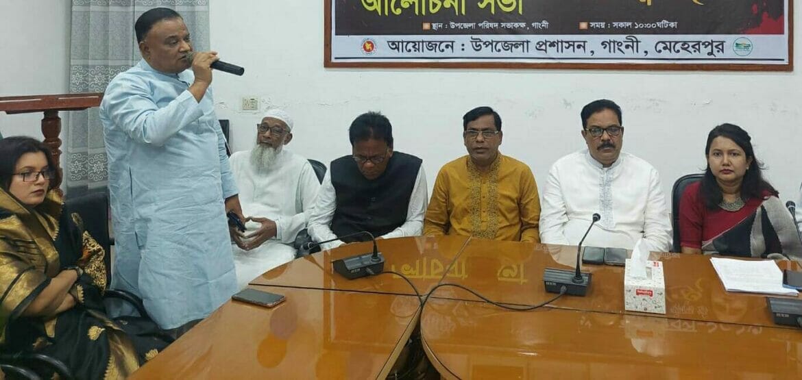 আজ শনিবার সকালে উপজেলা পরিষদ সম্মেলন কক্ষে আয়োজিত অনুষ্ঠানে উপজেলা নির্বাহী অফিসার সাজিয়া সিদ্দিকী সেতুর সভাপতিত্বে অনুষ্ঠানে প্রধান অতিথি হিসেবে উপস্থিত ছিলেন মেহেরপুর – ২ ( গাংনী) আসনের সংসদ সদস্য সাহিদুজ্জামান খোকন, বিশেষ অতিথি হিসেবে উপস্থিত জেলা আওয়ামী লীগের সাধারণ সম্পাদক ও গাংনী উপজেলা পরিষদের চেয়ারম্যান এম এ খালেক, বীর মুক্তিযোদ্ধা সাবেক সংসদ সদস্য মকবুল হোসেন, গাংনী পৌরসভার মেয়র আহমেদ আলী, সহকারী কমিশনার ( ভুমি) নাদির হোসেন শামীম, গাংনী থানার ভারপ্রাপ্ত কর্মকর্তা ( ওসি) আব্দুর রাজ্জাক, গাংনী উপজেলা আওয়ামী লীগের সাধারণ সম্পাদক মকলেছুর রহমান মুকুল, উপজেলা জনস্বাস্থ্য প্রকৌশল অধিদপ্তরের গাংনী অফিসের সাবেক মুক্তিযোদ্ধা কমান্ডার মুনতাজ আলী, আমিরুল ইসলাম, উপজেলা ছাত্রলীগের সভাপতি আমিনুল ইসলাম সেন্টু, সহ বিভিন্ন সরাসরি দপ্তরের কর্মকর্তা , সাংবাদিকবৃন্দ, রাজনীতিবিদ, বিভিন্ন শিক্ষা প্রতিষ্ঠানের প্রধানগণসহ বিভিন্ন শ্রেণীপেশার মানুষ অংশগ্রহণ করেন।