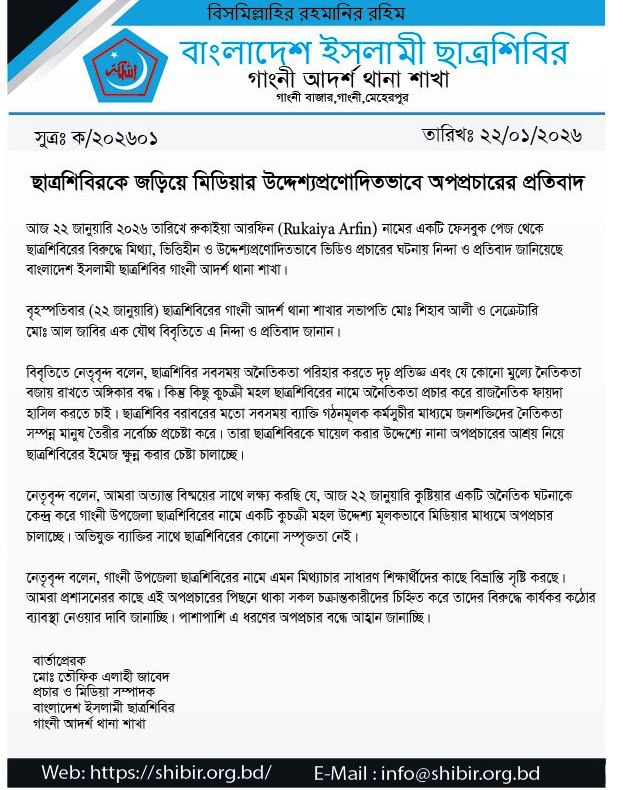 আজ ২২ জানুয়ারি ২০২৬ তারিখে রুকাইয়া আরফিন (Rukaiya Arfin) নামের একটি ফেসবুক পেজ থেকে ছাত্রশিবিরের বিরুদ্ধে মিথ্যা, ভিত্তিহীন ও উদ্দেশ্যপ্রণোদিতভাবে ভিডিও প্রচারের ঘটনায় নিন্দা ও প্রতিবাদ জানিয়েছে বাংলাদেশ ইসলামী ছাত্রশিবির গাংনী আদর্শ থানা শাখা।