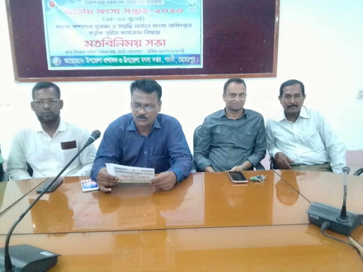 এম চোখ ডটকম,গাংনী: মৎস্য সম্পদের সুরক্ষা ও সমৃদ্ধি অর্জনে মৎস্য অধিদপ্তর কর্তৃক গৃহীত কার্যক্রম বিষয়ে সাংবাদিকদের সাথে মতবিনিময় সভা করেছে গাংনী উপজেলা মৎস্য দপ্তর। জাতীয় মৎস্য সপ্তাহ ২০২৩ উদযাপন উপলক্ষে আজ সোমবার সকাল ১১টায় উপজেলা পরিষদ হলরুমে এ মতবিনিময় সভা অনুষ্ঠিত হয়।