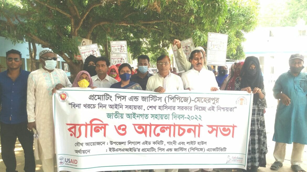 “বিনা খরচে নিন আইনি সহায়তা,শেখ হাসিনার সরকার দি”েছ এই নিশ্চয়তা ” এই প্রতিপাদ্যে গাংনী লিগ্যাল এইড কমিটি ও ইউএসএআইডি’র প্রমোটিং পিস এন্ড জাস্টিস (পিপিজে)এ্যাকটিভিটির র্যালী ও আলোচনা সভা অনুষ্ঠিত হয়েছে। আজ বুধবার সকালে গাংনী উপজেলা পরিষদ চত্বরে সংক্ষিপÍ র্যালী শেষে উপজেলা পরিষদ সভাকক্ষে আলোচনা সভা অনুষ্ঠিত হয়।