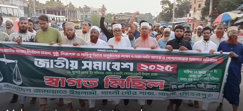 আসন্ন জাতীয় সংসদ নির্বাচন সুষ্ঠু ও শান্তিপূর্ণভাবে সম্পন্ন করতে ৭ দফা দাবি বাস্তবায়ন, ঢাকার মহাসমাবেশ সফল করার আহ্বান এবং গোপালগঞ্জে নিষিদ্ধ আওয়ামী লীগ কর্তৃক এনসিপির গাড়ী বহরে হামলার প্রতিবাদে মেহেরপুরের গাংনীতে বিক্ষোভ মিছিল করেছে জামায়াতে ইসলামী।