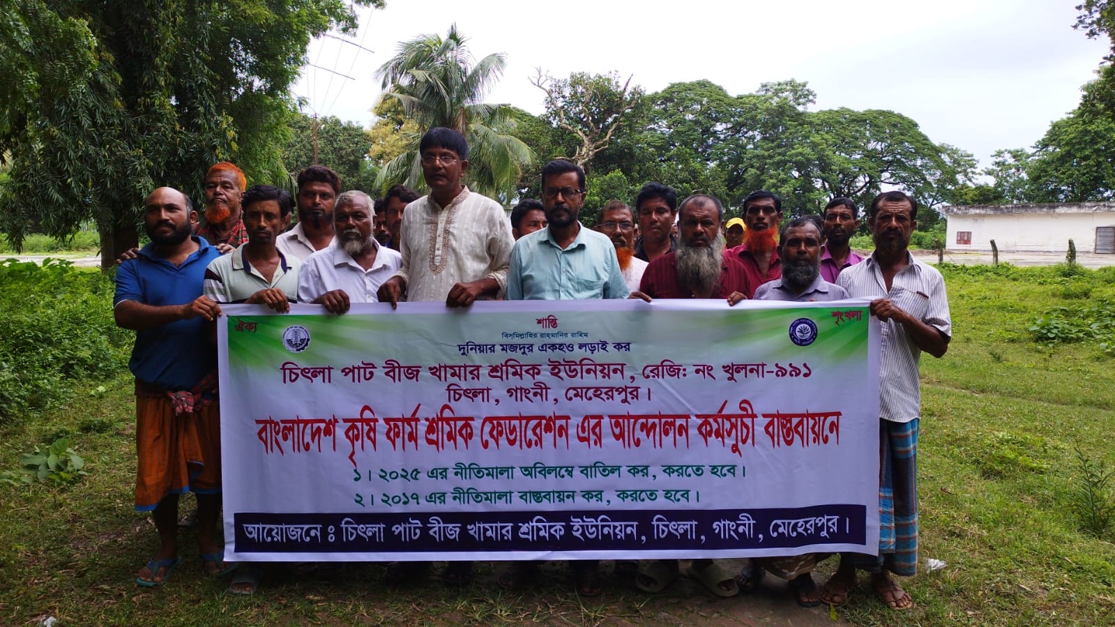 অর্থ মন্ত্রণালয় কর্তৃক জারিকৃত “দৈনিক ভিত্তিতে সাময়িক শ্রমিক নিয়মিতকরণ নীতিমালা-২০২৫” বাতিল এবং কৃষি ফার্ম শ্রমিক নিয়োগ ও নিয়ন্ত্রণ নীতিমালা-২০১৭ অনুযায়ী বিএডিসিসহ সকল কৃষি ফার্ম শ্রমিককে নিয়মিতকরণসহ ১৩ দফা দাবি বাস্তবায়নের আহ্বান জানান শ্রমিকরা।