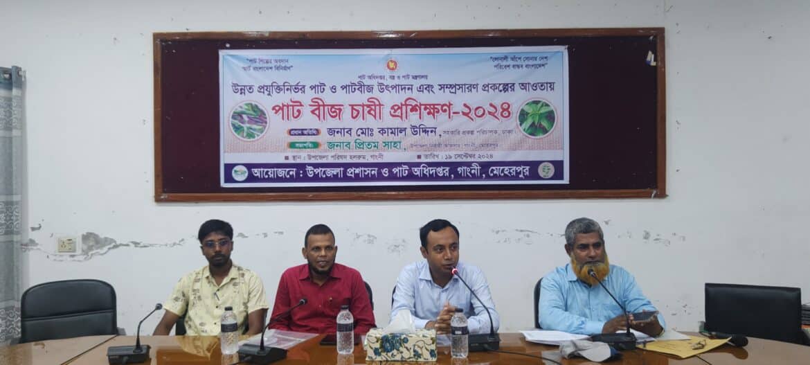 গাংনী উপজেলা নির্বাহী অফিসার প্রীতম সাহার সভাপতিত্বে প্রধান অতিথি ছিলেন পাট অধিদপ্তরের সহকারি প্রকল্প পরিচালক কামাল উদ্দিন। উপ-সহকারী পাট উন্নয়ন কর্মকর্তা মেহেদী হাসানের সঞ্চালনায় অনুষ্ঠানে বিশেষ অতিথি হিসেবে চাষিদের উদ্দেশ্যে বক্তব্য রাখেন মেহেরপুর জেলা পাট উন্নয়ন কর্মকর্তা আ ক ম হারুন অর রশীদ। উপজেলার বিভিন্ন গ্রামের ৭৫ জন চাষী এ প্রশিক্ষণে অংশ নেন।