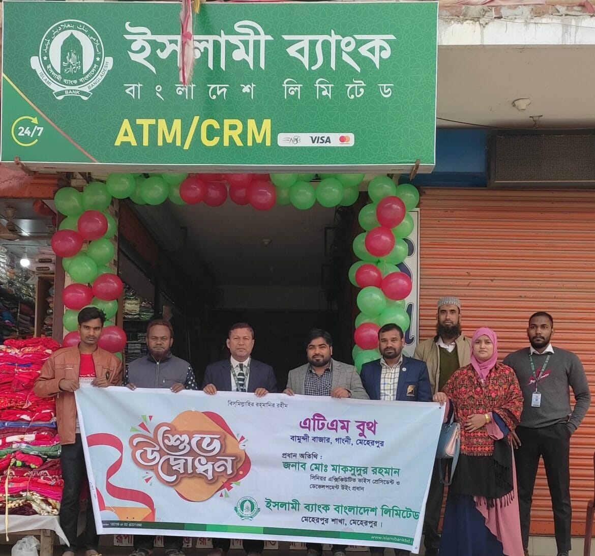 এম চোখ ডট কম, গাংনী: মেহেরপুর গাংনী উপজেলার বামন্দী বাজার বিশ্বাস টাওয়ার  ইসলামী ব্যাংক এটিএম বুথের উদ্বোধন করা হয়েছে। আজ বুধবার সকাল ৯ টার দিকে বুথের উদ্বোধন করেন ইসলামী ব্যাংক বাংলাদেশ লিমিটেডের সিনিয়র এক্সিকিউটিভ ভাইস প্রেসিডেন্ট ও ডেভেলপমেন্ট উইং প্রধান মাকসুদুর রহমান। মেহেরপুর শাখা প্রধান জাহাঙ্গীর আলম, ইসলামী ব্যাংক বামুন্দী আউটলেটের এজেন্ট ও বিপি কর্পোরেশন এ স্বত্তাধিকারী সাজ্জাদ হোসাইন পলাশ, বিশিষ্ট ব্যাবসায়ী চঞ্চল মিয়া, বামন্দী এজেন্ট শাখার ইনচার্জ হামিদুর রহমান সহ বামন্দী এজেন্ট শাখার কর্মকর্তা ও স্থানীয় ব্যাবসায়ীরা এসময় সেখানে উপস্থিত ছিলেন। অত্র এলাকার মানুষের দীর্ঘদিনের প্রত্যাশা পূরন হওয়ায় আনন্দ প্রকাশ করেন তারা।