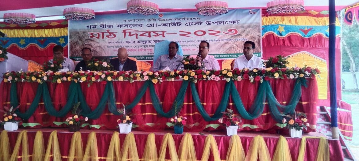 মেহেরপুর বীজ উৎপাদন খামার বিএডিসি বারাদী খামারে গম বীজ ফসলের গ্রো আউট টেস্ট উপলক্ষে মাঠ দিবস অনুষ্ঠিত হয়েছে। শনিবার সকাল ১০ টায় বীপ্রকে বিএডিসি বারাদী গুদাম চত্বরে বীপ্রকে বিএডিসি চুয়াডাঙ্গা দপ্তরের বাস্তবায়নে ও মেহেরপুর বীজ উৎপাদন খামারের আয়োজনে মাঠ দিবস অনুষ্ঠিত হয়। ২০২১- ২২ উৎপাদন বর্ষের গম বীজ ফসলের গ্রো আউট টেস্ট বাস্তবায়নের নিমিত্তে চারটি জাতের ১৫০ টি প্লটে গ্রো আউট টেস্ট করা হয়। কৃষিবিদ প্রদীপ চন্দ্র দে মহা-ব্যবস্থাপক (বীজ) বিএডিসি ঢাকার সভাপতিত্বে প্রধান অতিথি ছিলেন বিএডিসি’র চেয়ারম্যান আব্দুল্লাহ সাজ্জাদ এনডিসি। বিশেষ অতিথি হিসেবে উপস্থিত ছিলেন আব্দুস সামাদ সদস্য পরিচালক (সার ব্যবস্থাপনা) বিএডিসি ঢাকা। অনুষ্ঠানে আরও উপস্থিত ছিলেন দেলোয়ার হোসেন যুগ্ম পরিচালক (বীঃপ্র) বিএডিসি চুয়াডাঙ্গা, কেএম মনিরুজ্জামান উপ-পরিচালক (খামার) বিএডিসি বারাদী, জাহিদুর রহমান উপ-পরিচালক (খামার) গোকুলনগর বীজ উৎপাদন খামার বিএডিসি দত্তনগর, শামীম হায়দার উপ-পরিচালক (বীঃপ্র) বিএডিসি মেহেরপুর, আবু শাহাদত মোঃ শোয়েব উপ-পরিচালক (কঃগ্রোঃ) বিএডিসি চুয়াডাঙ্গা সহ খুলনা বিভাগীয় বিএডিসির বিভিন্ন দপ্তরের কর্মকর্তাবৃন্দ।