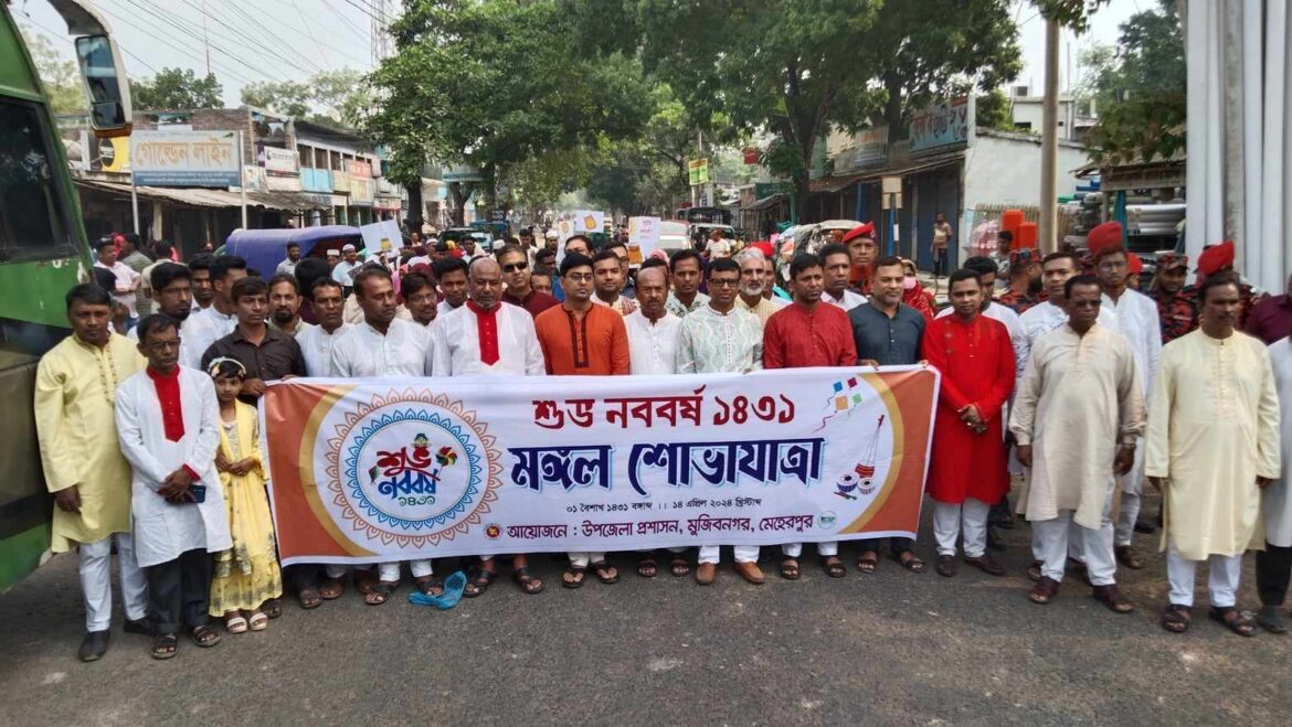 এরপরে উপজেলা নির্বাহী অফিসার খাইরুল ইসলামের নেতৃত্বে মুজিবনগর মাধ্যমিক বিদ্যালয় প্রাঙ্গণ থেকে একটি বর্ণাঢ্য মঙ্গল শোভাযাত্রা বের হয়ে কেদারগঞ্জ বাজার প্রদক্ষিণ করে উপজেলা পরিষদ চত্তরে এসে শেষ হয় । এতে অংশ নেন উপজেলা সহকারী কমিশনার ভূমি নাজমুস সাদাত রত্ন, মুজিবনগর থানার অফিসার ইনচার্জ ওসি উজ্জ্বল কুমার দত্ত, উপজেলা আওয়ামীলীগের সভাপতি রফিকুল ইসলাম তোতা, উপজেলা কৃষি অফিসার আব্দুল মোমেন ,মহাজনপুর ইউনিয়ন পরিষদের চেয়ারম্যান আমাম হোসেন মিলু, বাগোয়ান ইউনিয়ন পরিষদের চেয়ারম্যান আয়ূব হোসেন, উপজেলা প্রকল্প বাস্তবায়ন কর্মকর্তা মাসরুবা আলম, উপজেলা মহিলা বিষয়ক কর্মকর্তা সেলিম রেজা, উপজেলা জনস্বাস্থ্য প্রকৌশল কর্মকর্তা জাহাঙ্গীর আলম সহ সর্বস্তরের মানুষ অংশগ্রহণ করেন। শোভাযাত্রা শেষে উপজেলা পরিষদ চত্বরে সকলেই পান্তা উৎসবে অংশগ্রহণ করেন এবং উপজেলা শিল্পকলা একাডেমীর শিল্পী গনের অংশগ্রহণে সাংস্কৃতিক অনুষ্ঠান পরিবেশিত হয়।