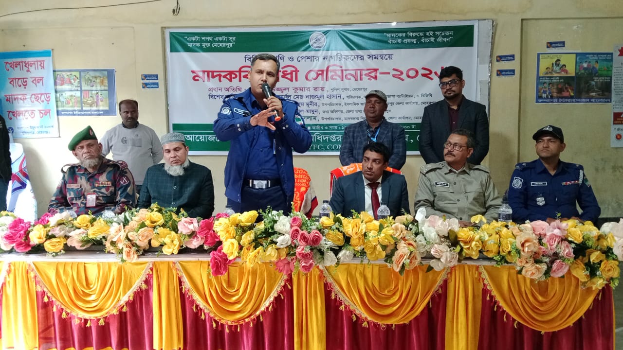 সেমিনারে প্রধান অতিথি হিসেবে উপস্থিত ছিলেন মেহেরপুরের পুলিশ সুপার জনাব উজ্জ্বল কুমার রায়। তিনি তাঁর বক্তব্যে বলেন, মাদক শুধু একজন মানুষকে নয়, একটি পরিবার এবং পুরো সমাজকে ধ্বংসের পথে ঠেলে দেয়। মেহেরপুরকে মাদকমুক্ত করতে হলে কেবল আইন প্রয়োগ যথেষ্ট নয়, প্রয়োজন সামাজিক সচেতনতা ও পারিবারিক মূল্যবোধ জাগ্রত করা।