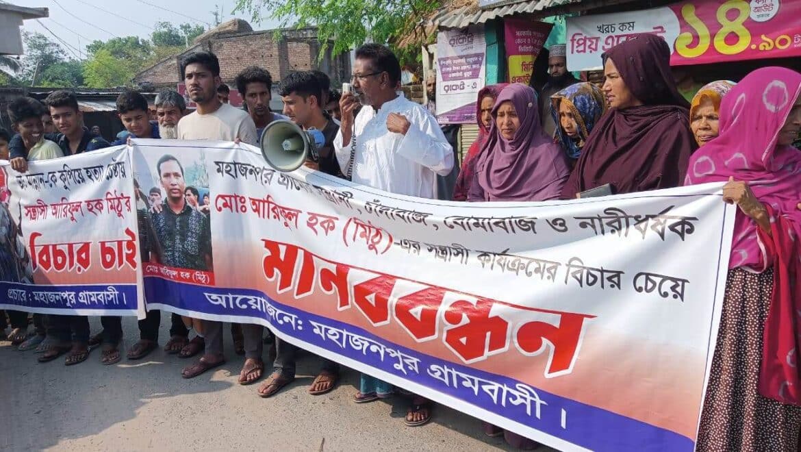 মুজিবনগরে হত্যাসহ বিভিন্ন অভিযোগে যুবলীগ নেতা মিঠুর বিরুদ্ধে মানববন্ধন করছে এলাকাবাসী