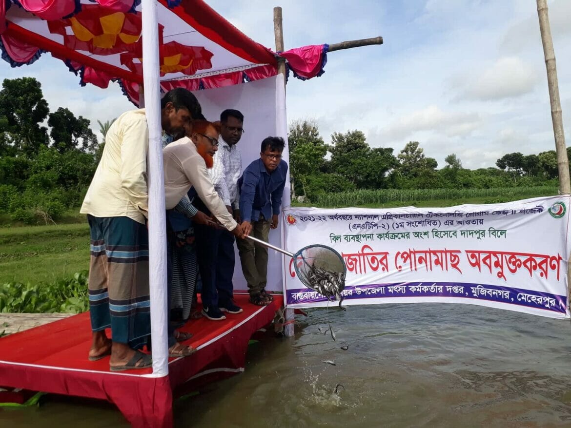 মুজিবনগর দাদপুর বিলে দেশীয় প্রজাতির পোনামাছ অবমুক্তকরণ