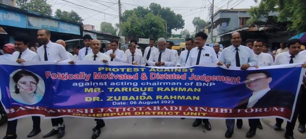 তারেক রহমান ও তার স্ত্রী জোবায়দা রহমানের রায়ের প্রতিবাদে মেহেরপুরে বিক্ষোভ মিছিল ও মানববন্ধন কর্মসূচি পালন করেছে জাতীয়তাবাদী আইনজীবী পরিষদ। আজ সকাল ১১:০০ টার দিকে জেলা আইনজীবী পরিষদের সামনে থেকে একটি বিক্ষোভ মিছিল বের করা হয়। মিছিলে নেতৃত্ব দেন জেলা জাতীয়তাবাদী আইনজীবী পরিষদের সাধারণ সম্পাদক এডভোকেট মারুফ আহমেদ বিজন। জাতীয়তাবাদী আইনজী পরিষদের নেতা এডভোকেট কামরুল হাসান, এডভোকেট স্বপন সহ জাতীয়তাবাদী আইনজীবী পরিষদের আইনজীবীরা মিছিলে অংশ নেয়। মিছিলটি শহরের প্রধান সড়ক, কোট প্রাঙ্গন ও জেলা পরিষদের কার্যালয় চত্বর ঘুরে একই স্থানে গিয়ে শেষ হয়। পরে সেখানে মানববন্ধন কর্মসূচি পালন করা হয়।