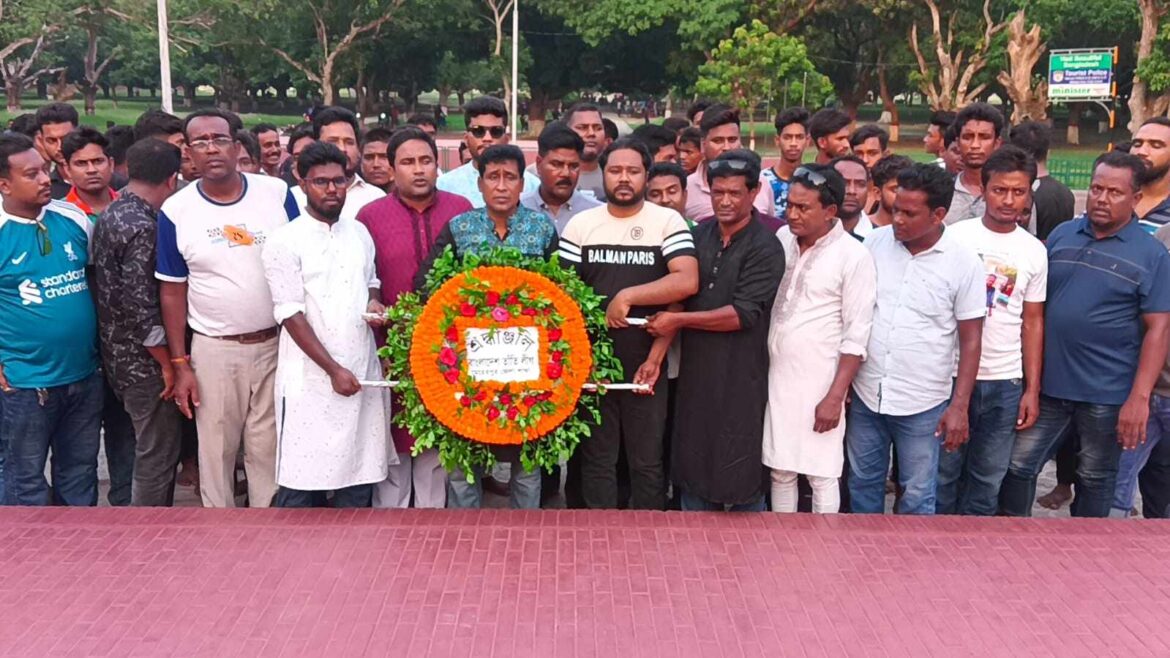 বৃহস্পতিবার বিকেলে মেহেরপুর জেলা তাঁতী লীগের আহ্বায়ক আরিফুল ইসলাম মানিকের নেতৃত্বে এই পুষ্প মাল্য অর্পণ করা হয় ।