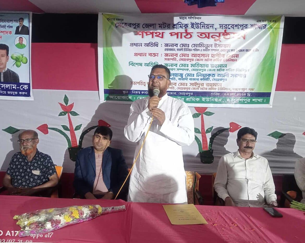 মেহেরপুর জেলা মটর শ্রমিক ইউনিয়ন দরবেশপুর শাখার নবনির্বাচিত কার্যনির্বাহী পরিষদের শপথ গ্রহণ।