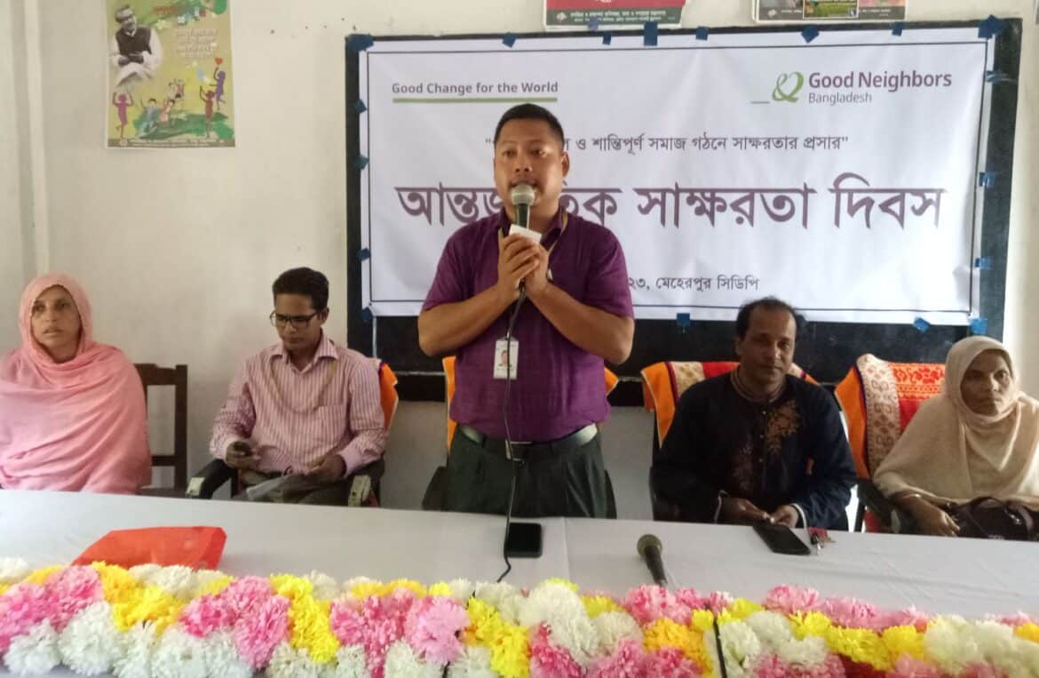 এম চোখ ডটকম,মুজিবনগর: “পরিবর্তনশীল ও শান্তিপূর্ণ সমাজ গঠনে স্বাক্ষরতার প্রসার” এ শ্লোগানে গুড নেইবারস্ বাংলাদেশ, মেহেরপুর সিডিপি’র উদ্যোগে গুড নেইবারস্ মেহেরপুর সিডিপি’র বল্লভপুর মিশন মাধ্যমিক বিদ্যালয় হলরুমে আন্তজাতিক স্বাক্ষরতা দিবস/২০২৩ উপলক্ষে আলোচনা সভা অনুষ্ঠিত হয়েছে। আজ বৃহস্পতিবার বিকেলে সিডিপি’র প্রজেক্ট ম্যানেজার মিঃ বিভব দেওয়ান এর সভাপতিত্বে অনুষ্ঠানে বক্তব্য রাখেন বল্লভপুর সরকারী প্রাথমিক বিদ্যালয়ে প্রধান শিক্ষক শতদল, বাগোয়ন ইউনিয়ন পরিষদের সদস্য মি. বাবুল মল্লিক, মেহেরপুর সিডিপি’র সিনিয়র প্রেগ্রাম অফিসার এস.এম. রিফাত আল মাহমুদ, সু-প্রতিবেশী মহিলা সমবায় সমিতির সভাপতি রেহেনা খাতুন প্রমুখ। সু-প্রতিবেশী মহিলা সমবায় সমিতির সদস্য ও স্পন্সর শিশুর মায়েরা এসময় উপ¯ি’ত ছিলেন।