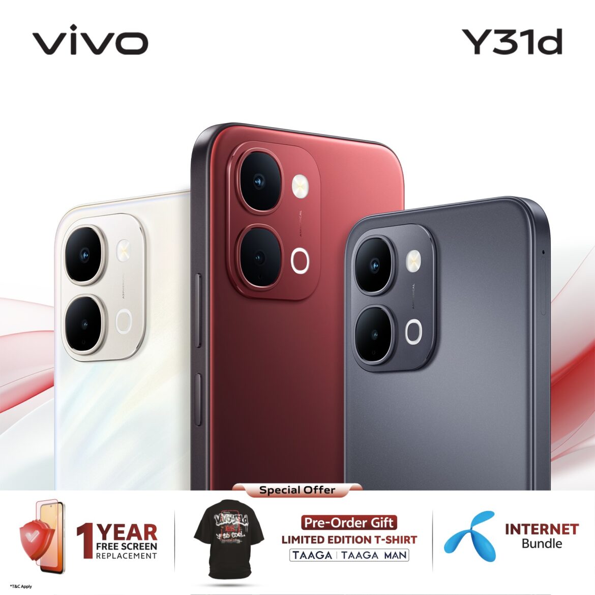 ভিভো ওয়াই৩১ডি -এর ৬/১২৮ জিবি ভেরিয়েন্টের দাম ২৪,৯৯৯ টাকা, ৮/১২৮ জিবি ২৬,৯৯৯ টাকা এবং ৮/২৫৬ জিবি ৩১,৯৯৯ টাকা। আগামী ১ থেকে ৪ মার্চ পর্যন্ত ফোনটির প্রি-অর্ডার চলবে। এর মধ্যে প্রি-অর্ডার করলেই ঈদ উপলক্ষে ভিভো ও তাগা/তাগা ম্যান-এর বিশেষ পার্টনারশিপে উপহার হিসেবে থাকছে লিমিটেড এডিশন তাগা ম্যান টি-শার্ট (শর্তসাপেক্ষ)।