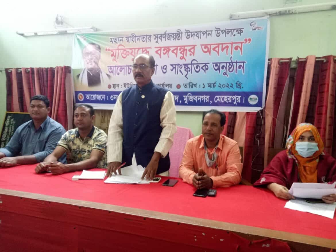 এম চোখ ডটকম মুজিবনগর ঃ:মহান স্বাধীনতার সুবর্ণজয়ন্তী উৎযাপন উপলক্ষে “মুক্তিযুদ্ধে বঙ্গবন্ধুর অবদান” বিষয়ে আলোচনাসভা ও সাংস্কৃতিক অনুষ্ঠান করেছে বাগোয়ান ইউনিয়ন পরিষদ। মঙ্গলবার বেলা ১১টায় বাগোয়ান ইউনিয়ন পরিষদ হল রুমে এ সভা অনুষ্ঠিত হয়।